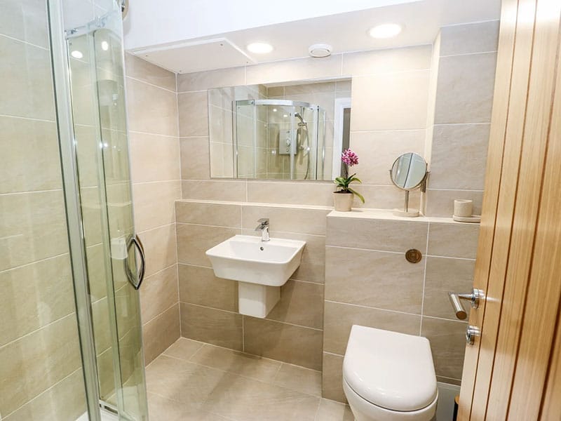 Shower room with walk-in shower, basin, and WC