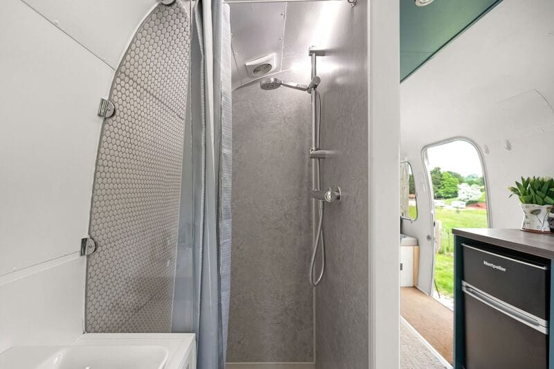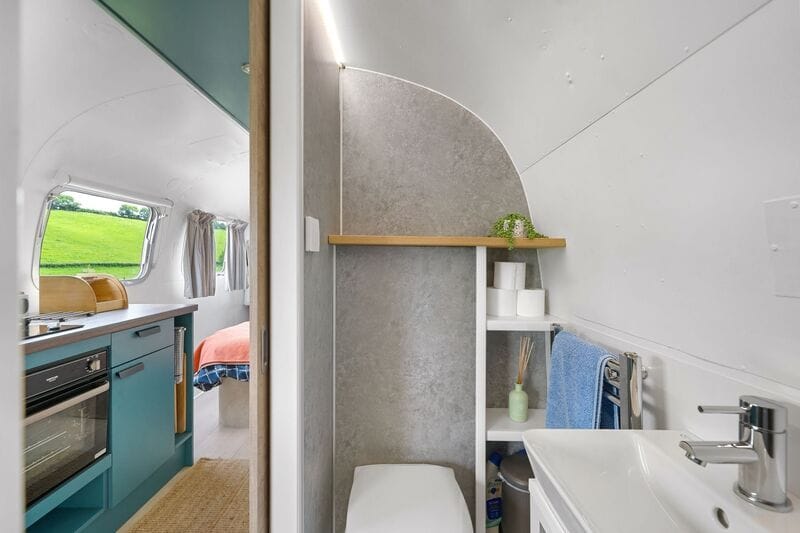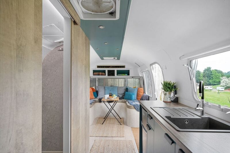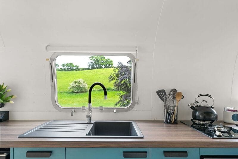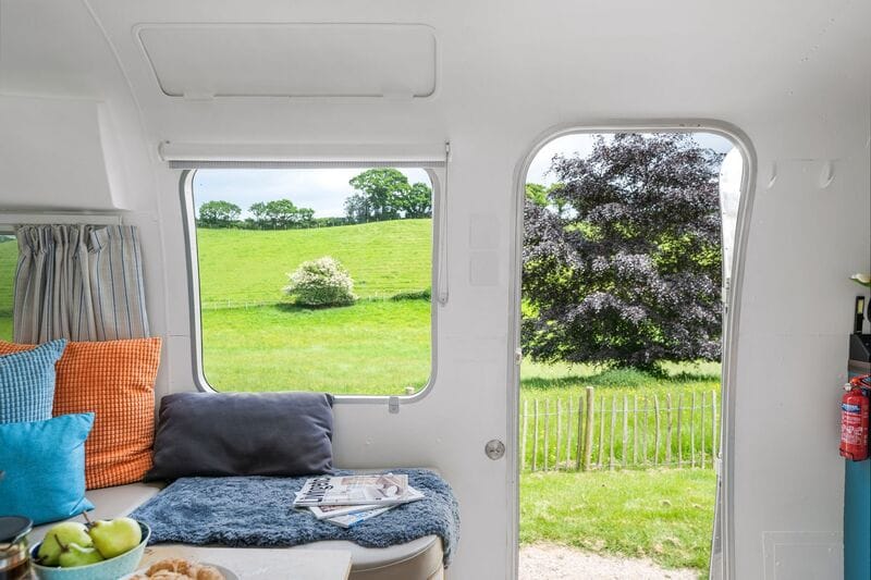 The gleaming silver caravan has privacy glass, roof fans, and central heating to keep things comfortable whatever the weather. Inside, the space feels bright and thoughtfully designed, with a compact but well-equipped kitchen and a custom-built sofa with a foldaway dining table set beside a cosy wood-burning stove. Retro speakers and a TV make it a great spot to relax with music, a good book, or a board game while enjoying views across the surrounding fields.