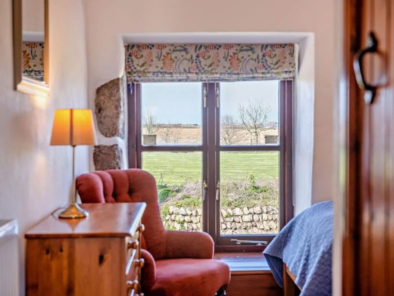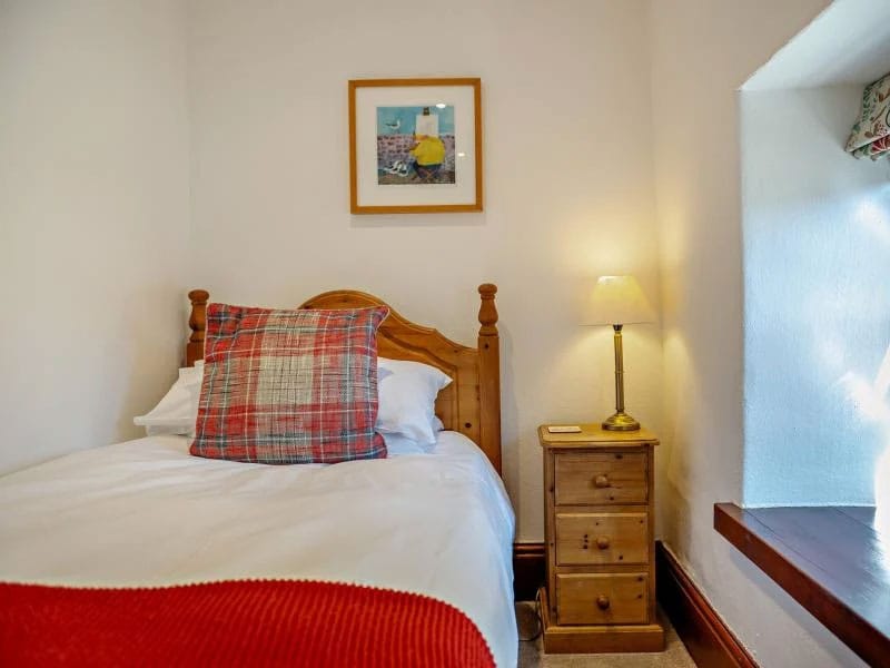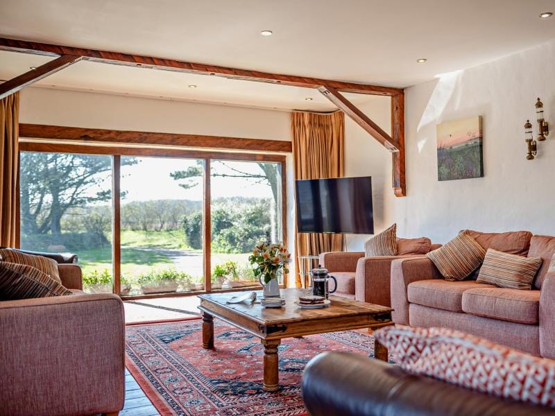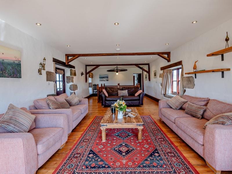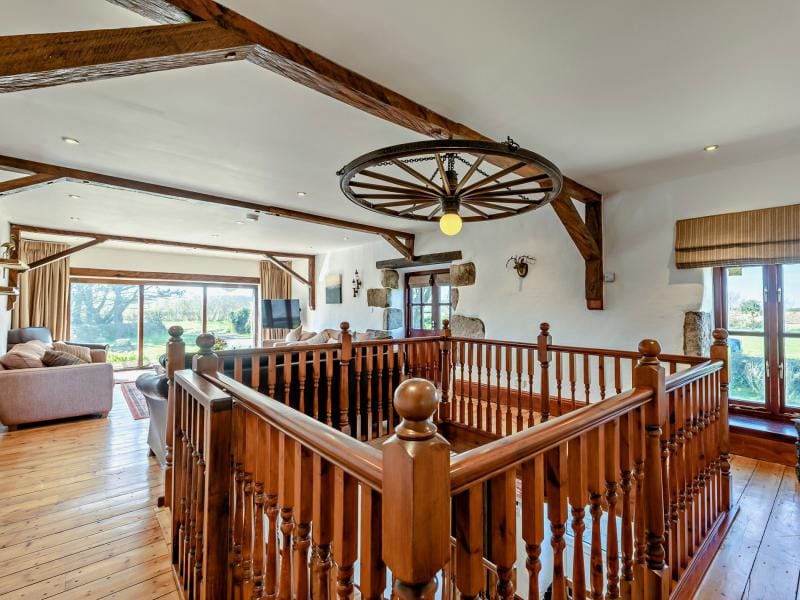 Upstairs, the sitting room is a standout space. A galleried layout, vaulted ceilings with exposed beams, and a statement light fitting crafted from an old cartwheel create a strong sense of character. Floor-to-ceiling windows frame sweeping views across the bay, while multiple seating areas offer flexibility for entertaining, watching a film, or simply unwinding with a good book. Two further bedrooms and a shower room are also located on this floor.