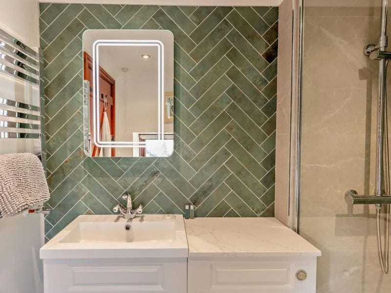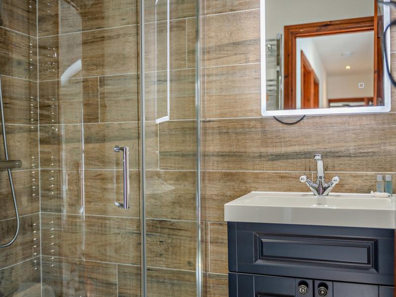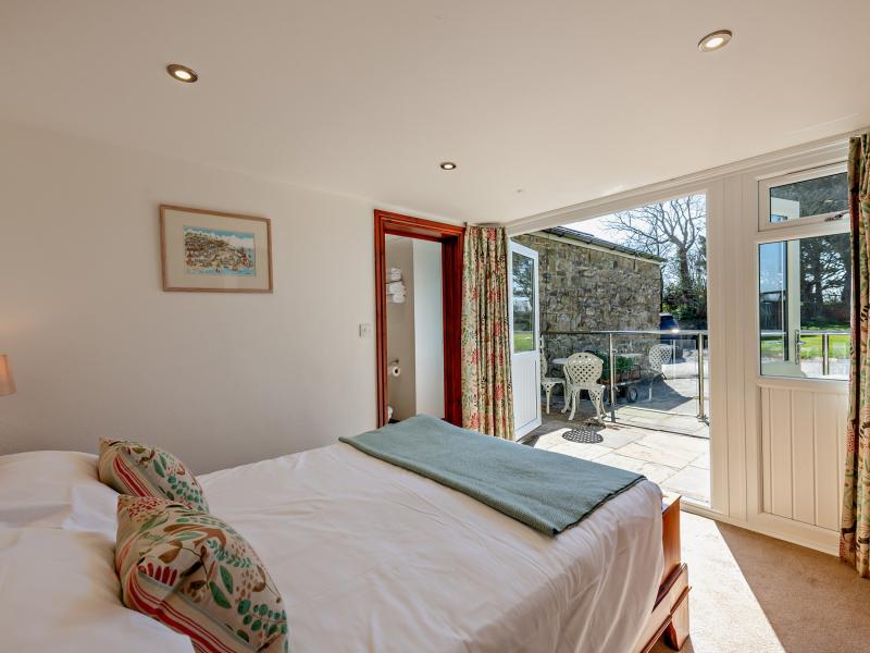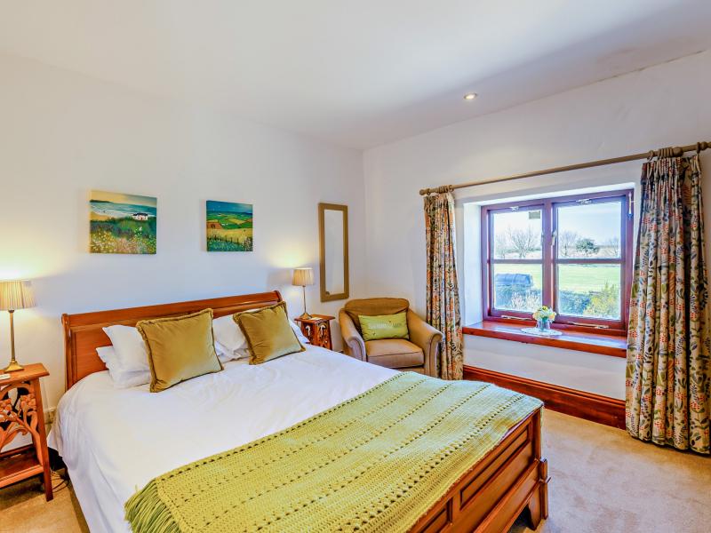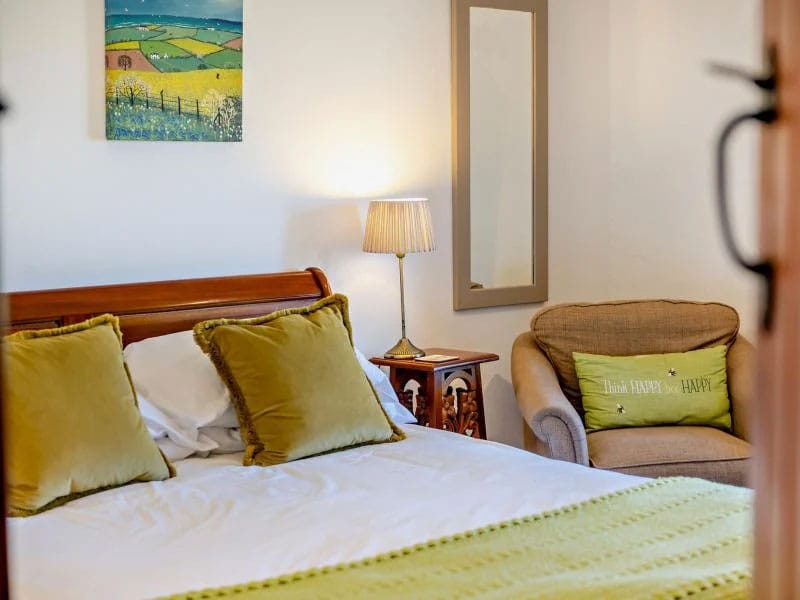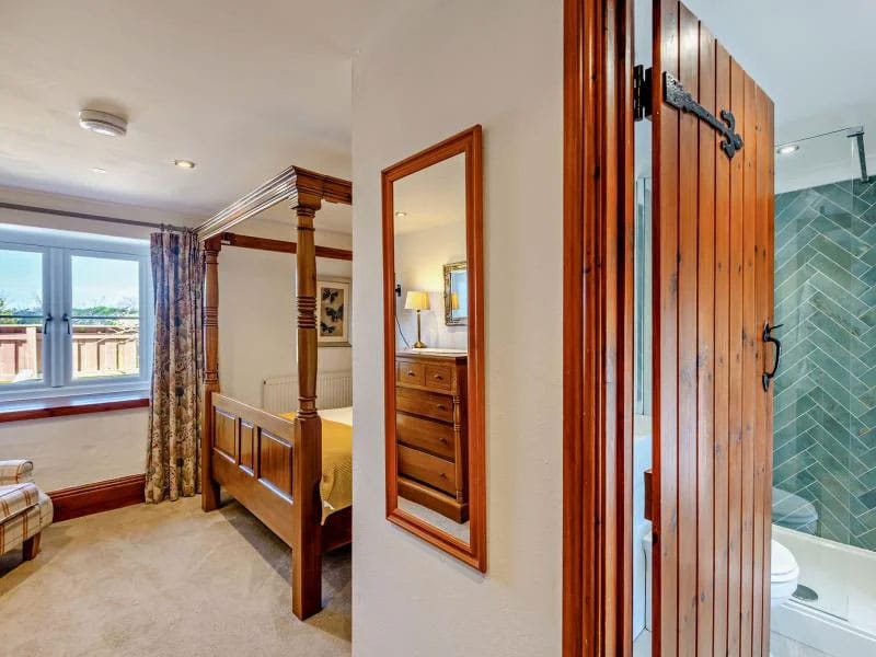 On the ground floor are three of the five bedrooms. One has a fabulous four-poster bed and a contemporary en-suite shower room with a rainfall shower. There is also a twin bedroom and a double with its own en-suite, the latter benefiting from French doors that open to the garden and fill the room with natural light. Each bedroom is designed for comfort, with quality beds, crisp Egyptian cotton bedding, and views across the garden and surrounding countryside.