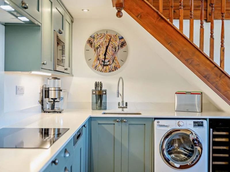 Electric oven and hob, microwave, coffee machine, dishwasher, fridge/freezer, drinks fridge, kettle, toaster, washing machine, tumble dryer