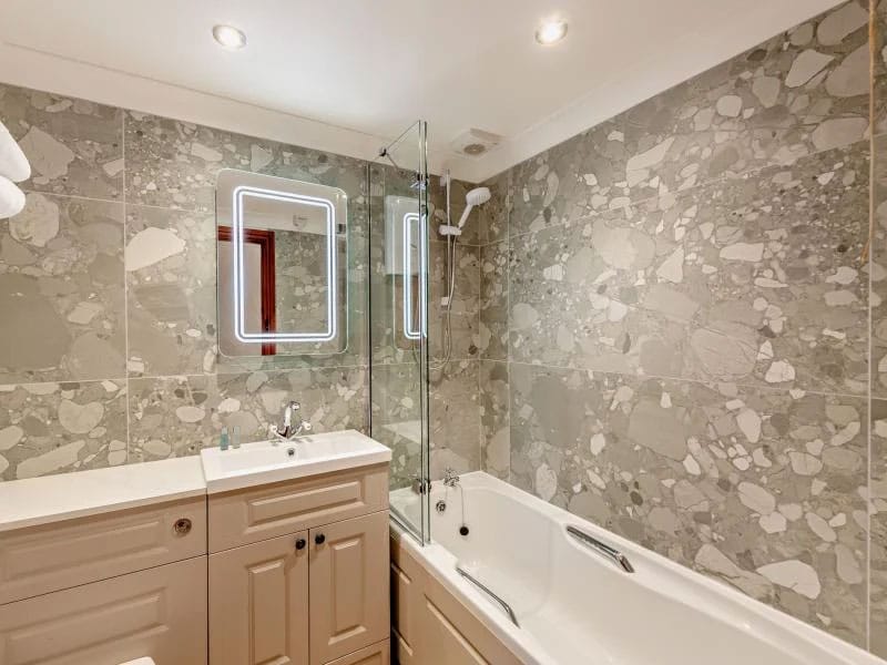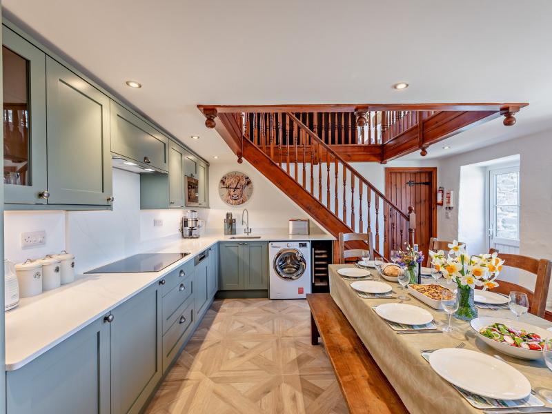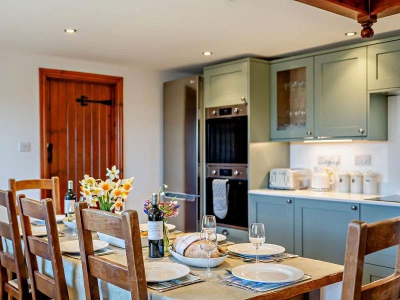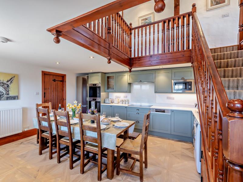 Also on this level is a spacious shaker-style kitchen, finished with duck egg blue cabinetry, marble worktops, and a full range of modern appliances. A large farmhouse table provides ample space for shared, home-cooked meals.