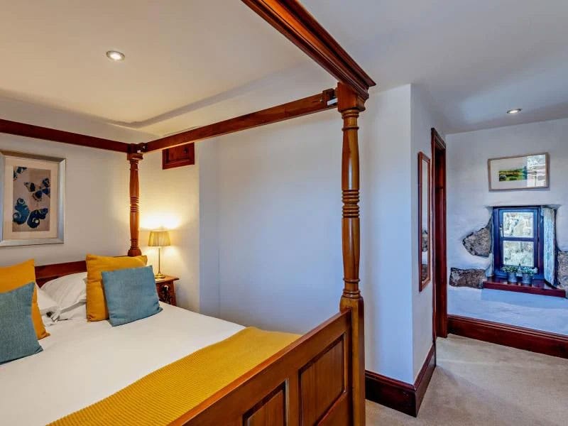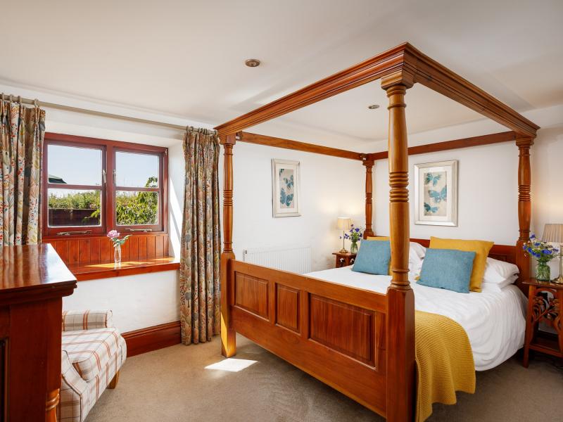 Bedroom with four poster king-size bed, and en-suite shower room with walk-in rainfall shower, basin, and WC