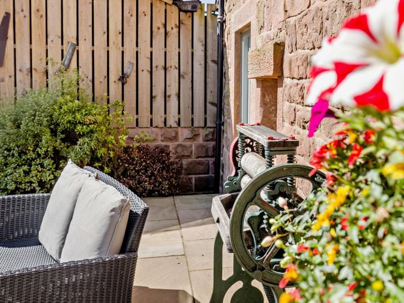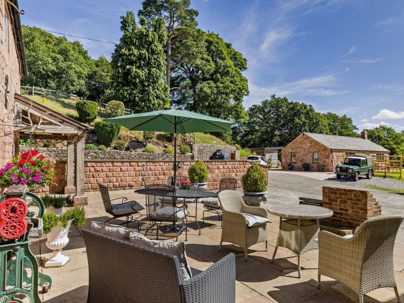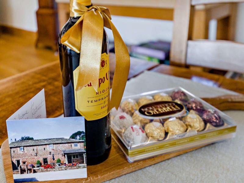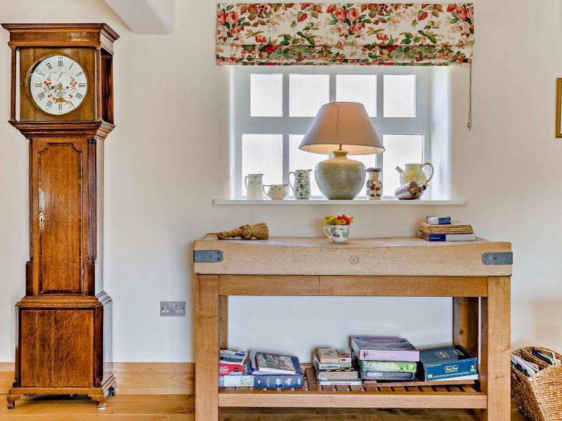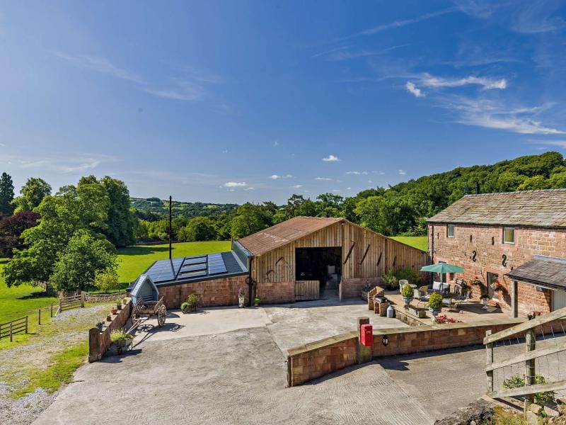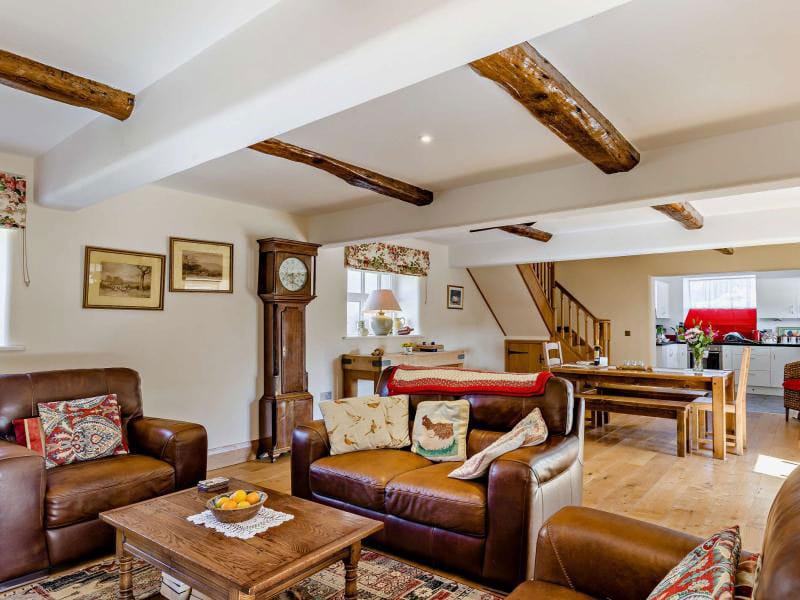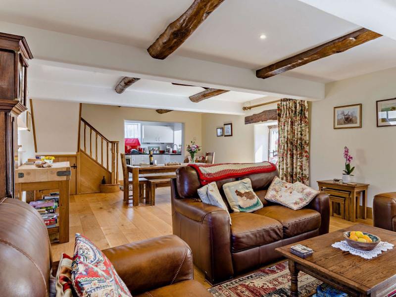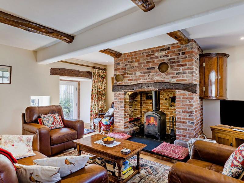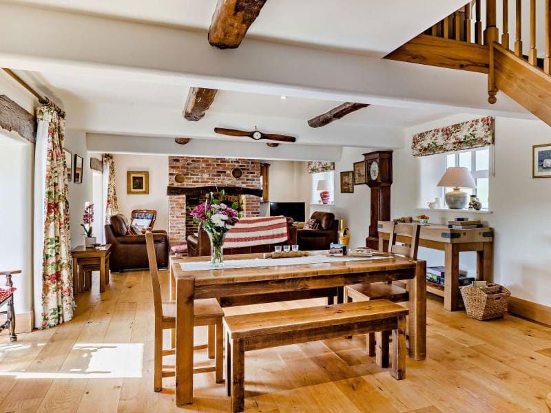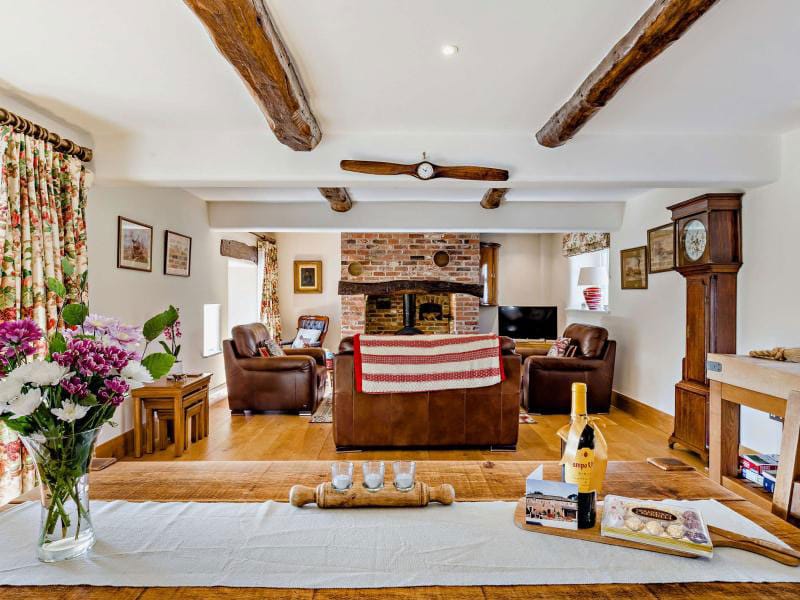 Open-plan living space with kitchen, dining table, and sitting area with wood burning stove