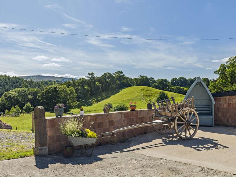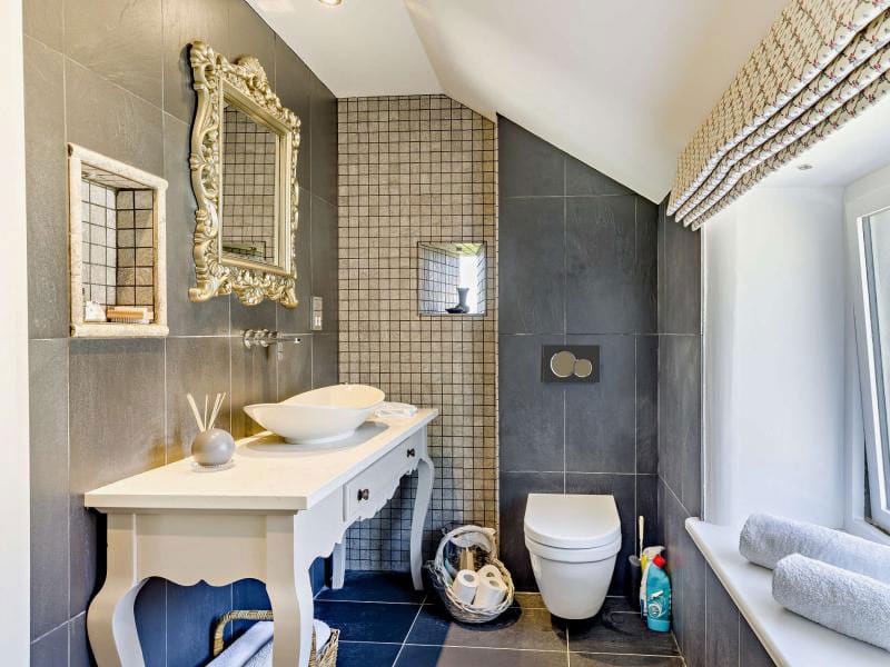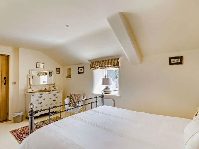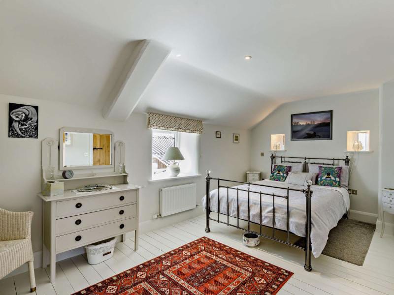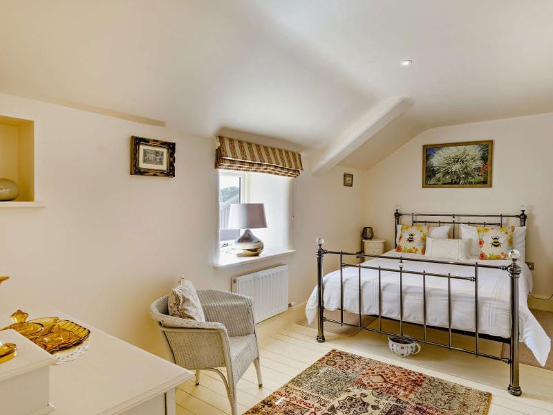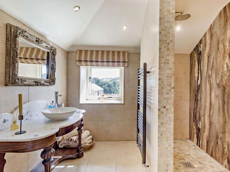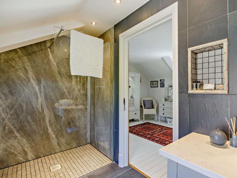 Bedroom with double bed, and en-suite shower room with walk-in shower, basin, and WC
