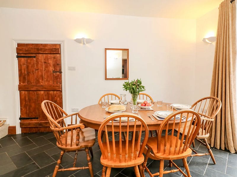 The bespoke country-style kitchen, with its beautiful bright red tiles and wooden cabinetry, is fully equipped with everything you need to prepare delicious home-cooked meals, while adjacent is a handy utility room. In the dining room, meals can be enjoyed around the large table beside a wood-burning stove, perfect for cosy evening dinners, and on warmer days, French doors open out onto the garden, where you can soak up the lovely views. If you’d prefer to eat out, there are several excellent dog-friendly pubs nearby serving hearty classics.
