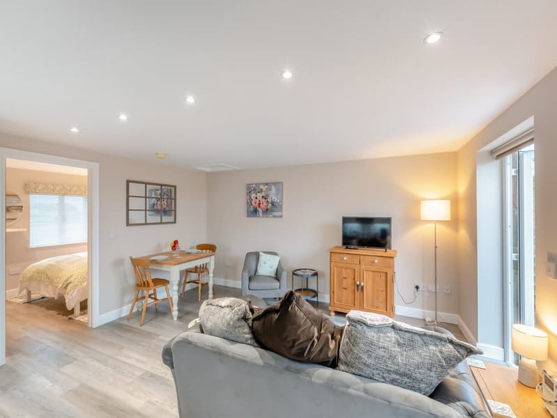 Open-plan living space with kitchen, dining table, and sitting area with French doors to the garden