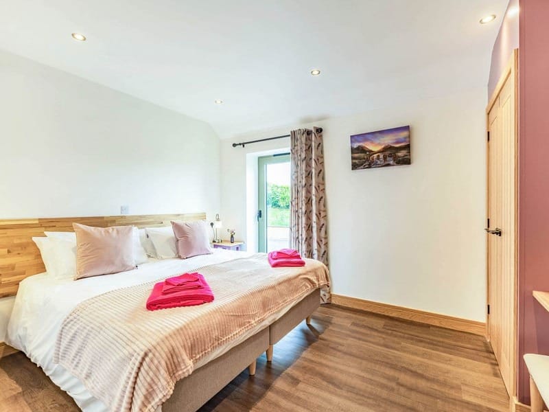 Bedroom with super king-size bed (zip and link, can be twins on request). and en-suite shower room with walk-in shower, basin, heated towel rail, and WC with grab rail