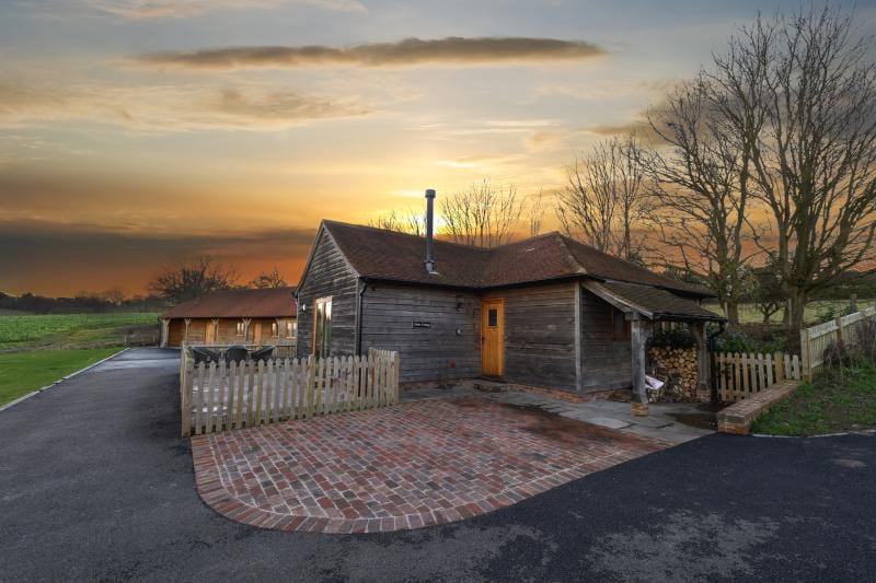 Open-plan living space with kitchen, dining table, and lounge with wood burning stove and French doors to the garden